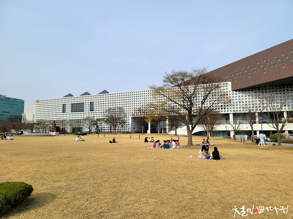 잔디밭에는 대학교답게 학생들이 둥글게 모여