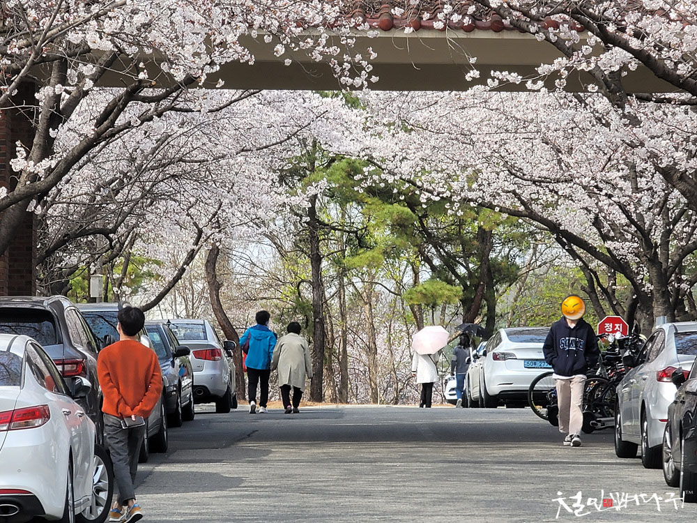 사람들이 천천히 걸으면서, 봄꽃 구경을 하는데,