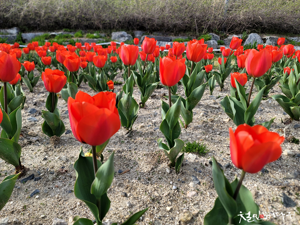 유성구청 아래, 천변에 튤립이 빨갛게 심어져