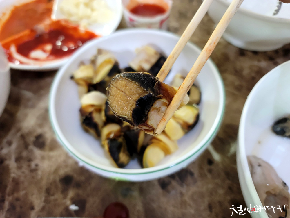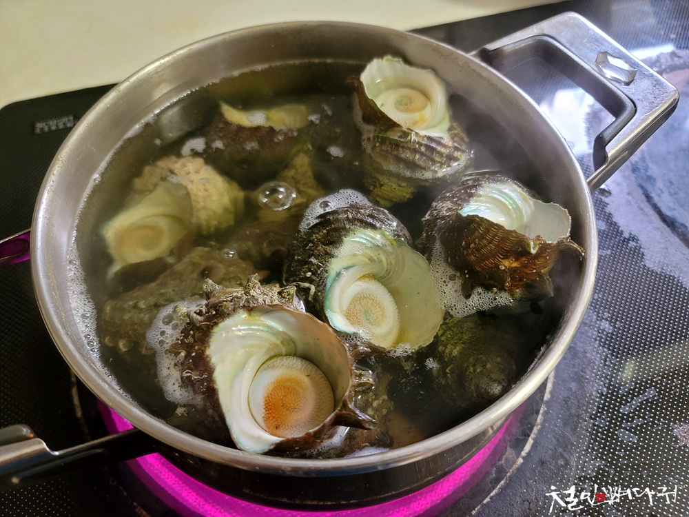 먹는 맛이 덜한데, 숙소로 공수해온 뿔소라는
