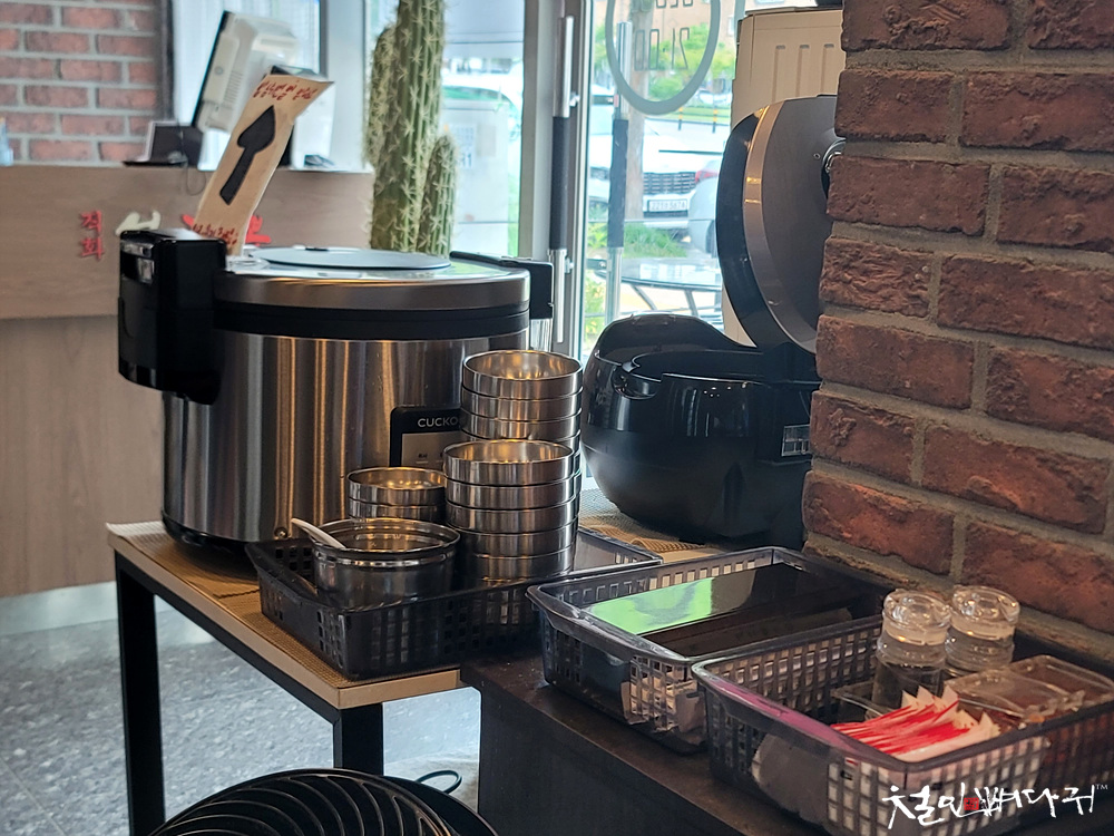 입구 옆에 무한리필로 밥을 퍼 먹을 수 있는
