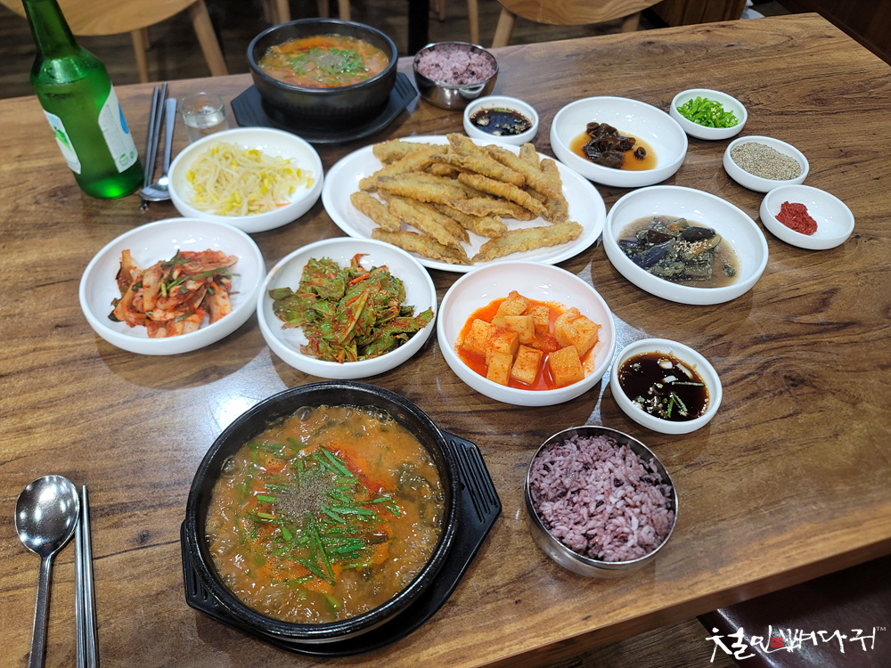 추어탕과 추어튀김, 반찬들이 한 상 차려졌습니다.