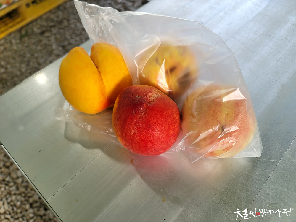 복숭아를 그냥 준 곳은 둥글바위농장(010-7193-0712).