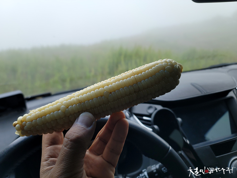 매봉산 풍력발전단지에 도착해서 옥수수를 먹었습니다.