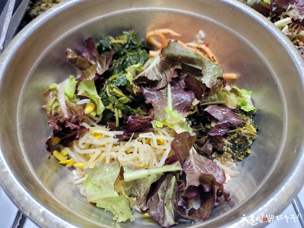 나물들, 야채들을 넣고 비벼 줍니다.