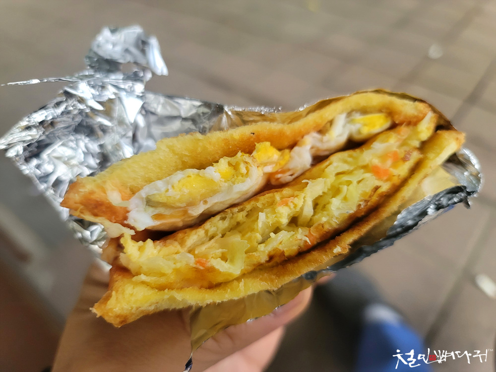 은박지에 쌓아서 보온상태로 있던 토스트는