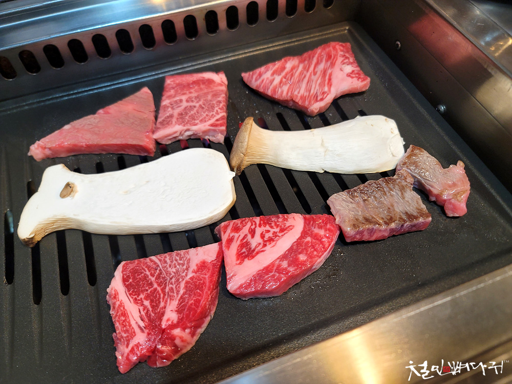 불판을 가열하고, 소고기와 버섯을 올렸습니다.