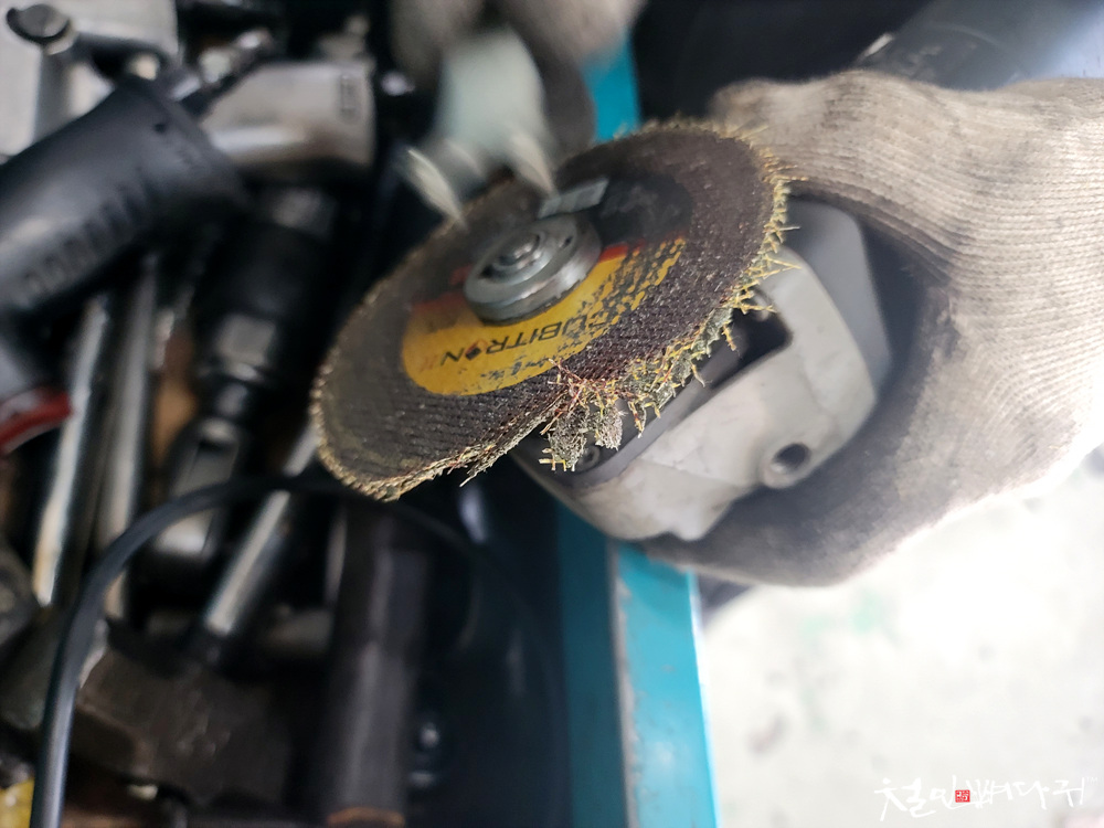 볼트 부분을 잘라내는 작업을 그라인더로 합니다.