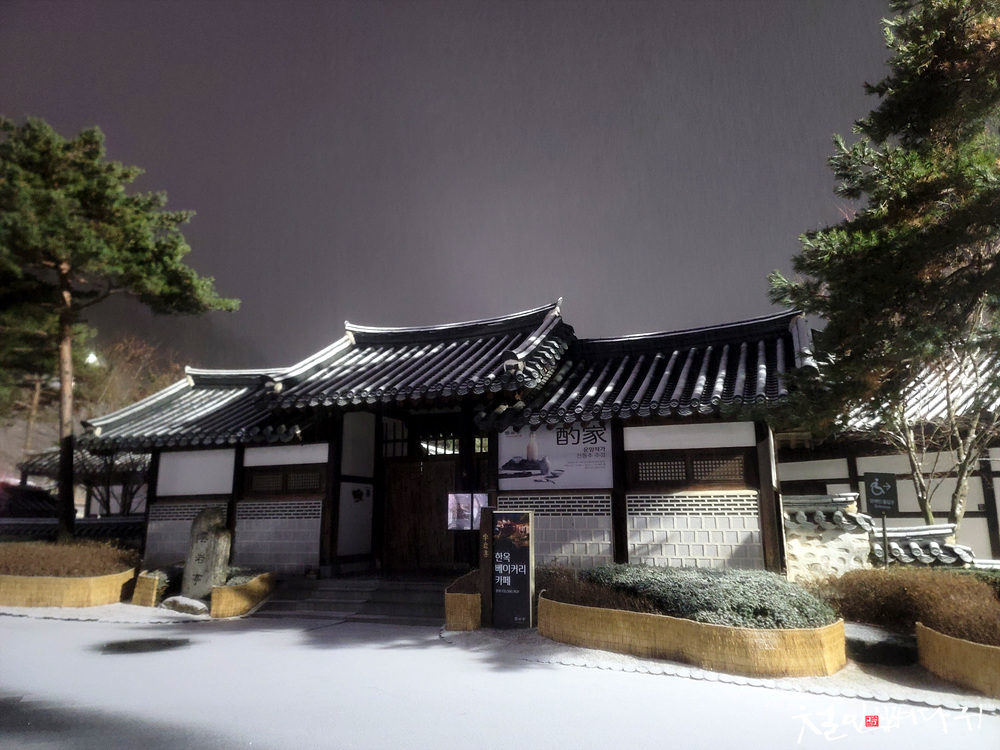 운암정의 지붕에도 눈이 쌓이기 시작했습니다.