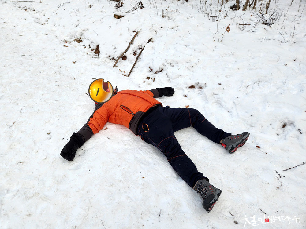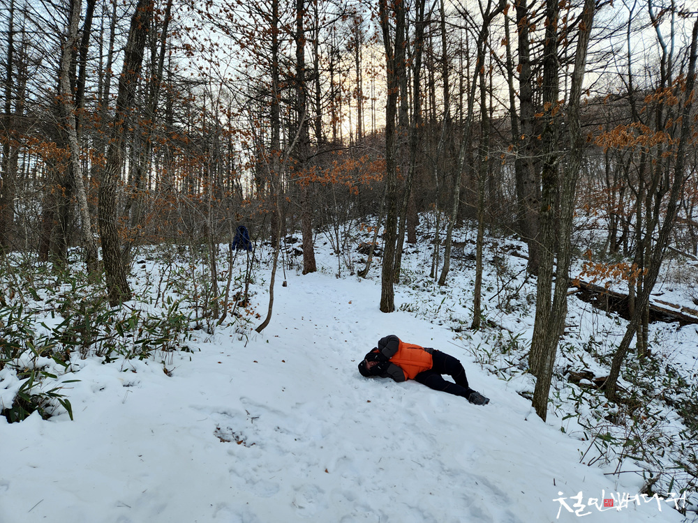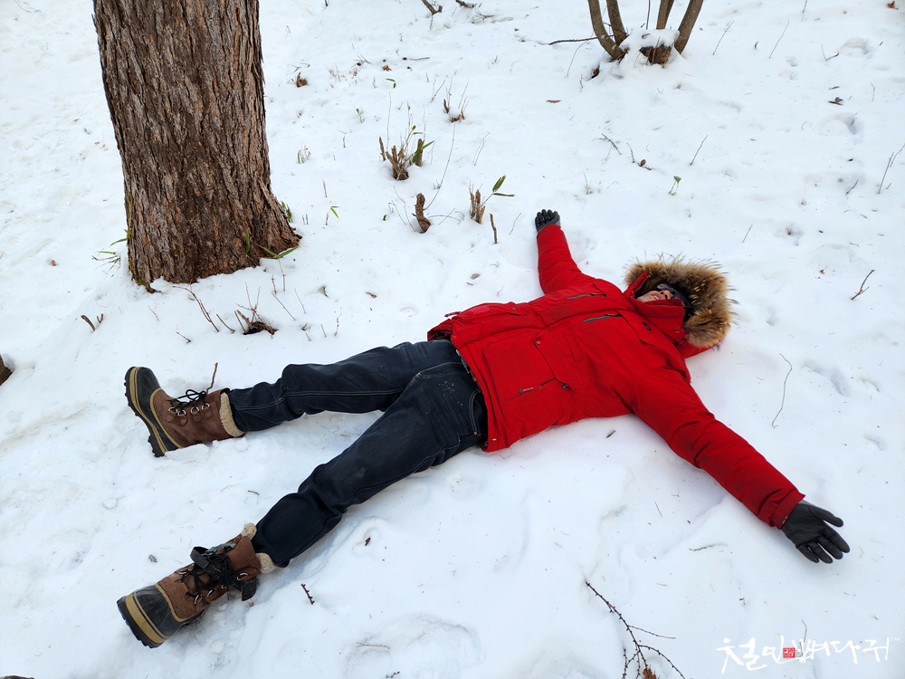눈 위에 눕고, 엎드리고, 쪼그려 앉고,