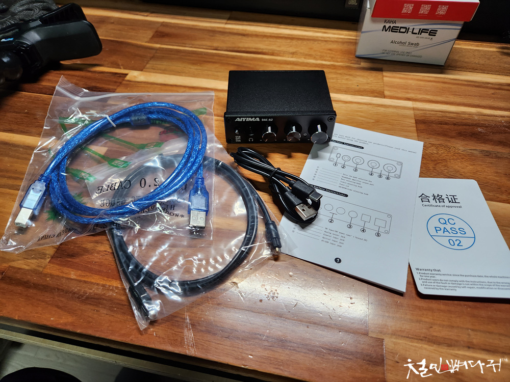 작은 앰프에 구성품으로 여러 케이블들이