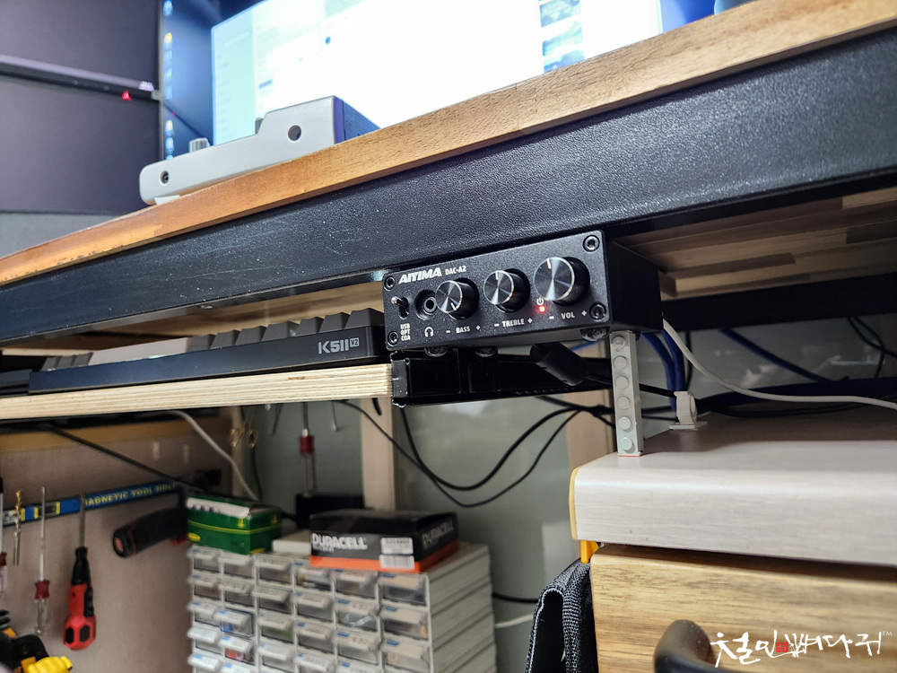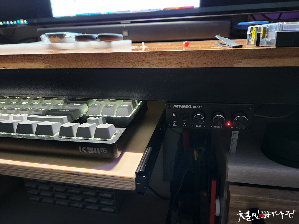 키보드 옆에 손 닿는 곳에 볼륨 노브가 있으니