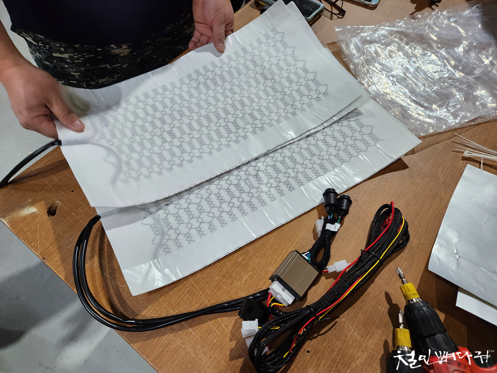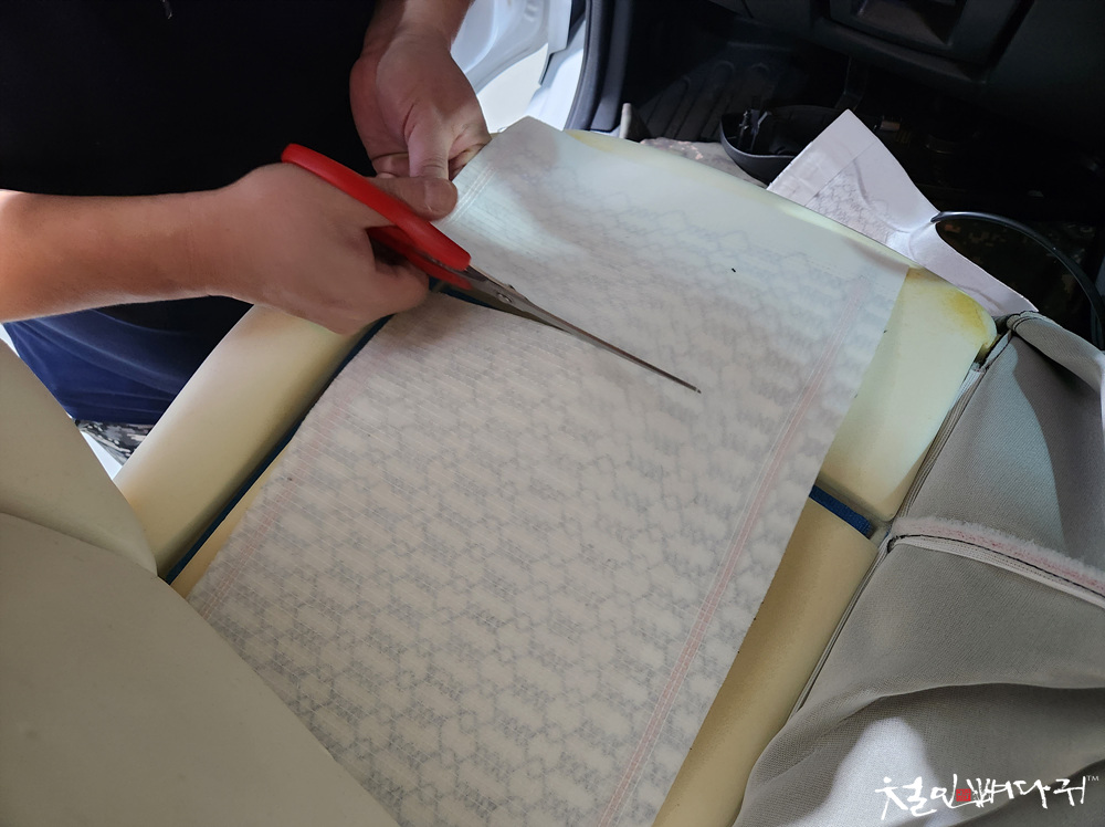 시트 안쪽을 기준으로 열선패드를 잘라서 붙였습니다.