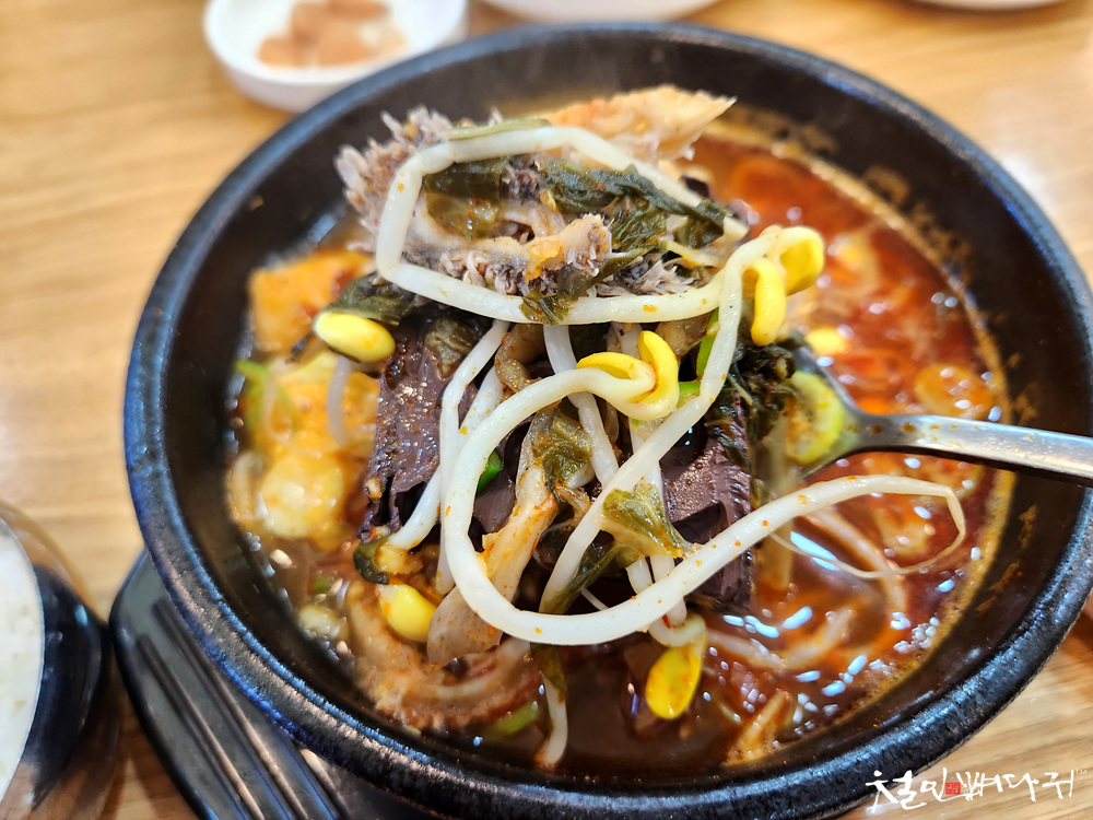 뚝배기에 뜨겁게 끓으면서 나왔습니다.