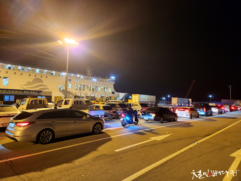 줄 서서 차량들이 배 안으로 들어가고, 안내에 따라