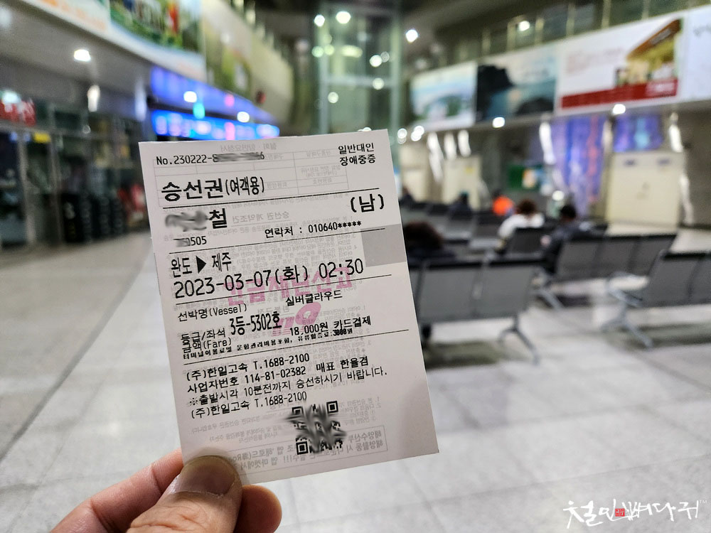 출항 30분 전까지 터미널 대합실에서 대기 중입니다.