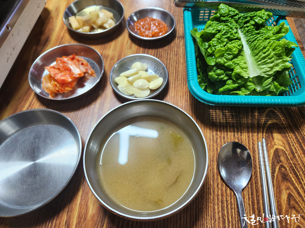 된장국과 상추, 반찬들이 간단히 차려집니다.