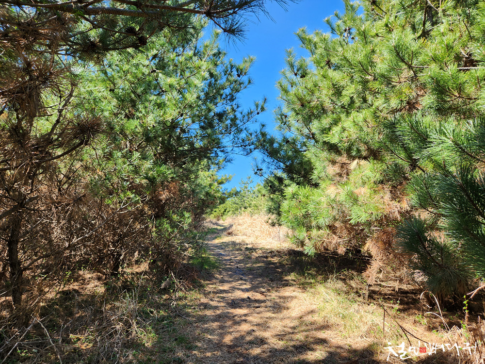 낮은 소나무들이 오름 분화구 둘레 오솔길