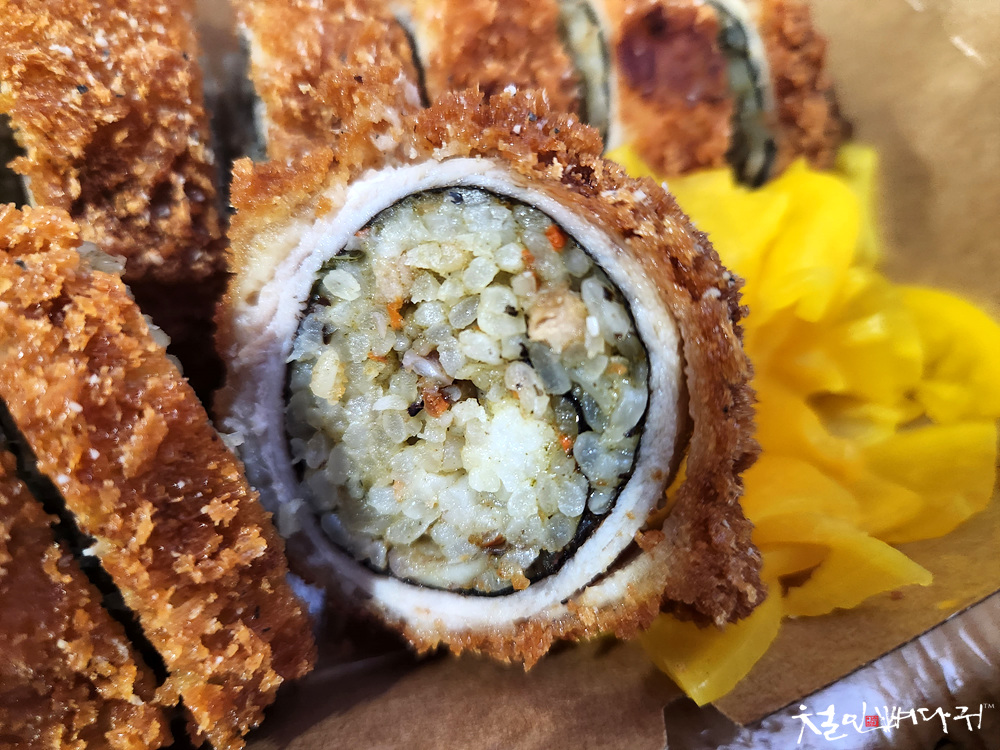 김밥을 돈까스처럼 만든 것으로 보이는데,