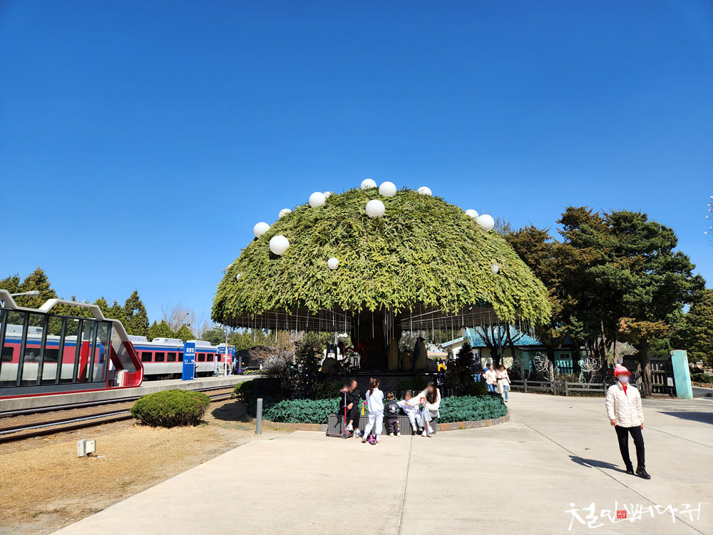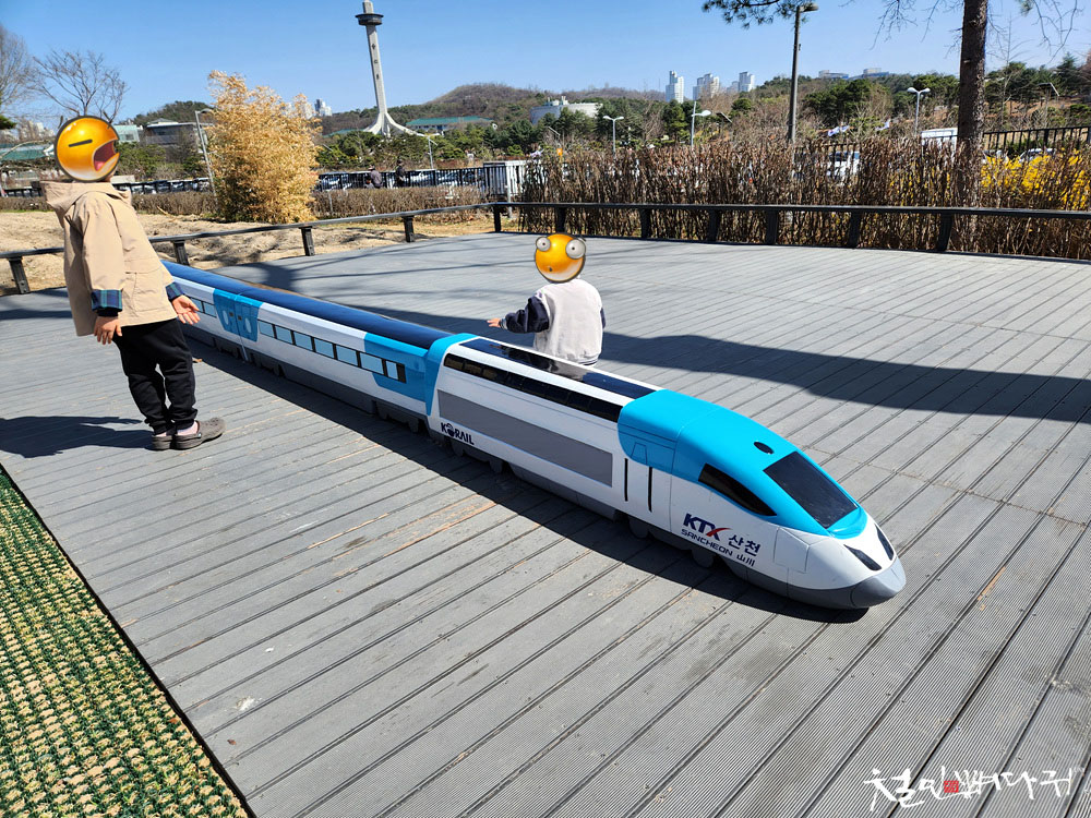 KTX산천 모형의 벤치가 있고,