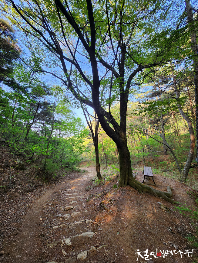 한참 내려오다가 그늘에 있는 벤치에 앉았습니다.