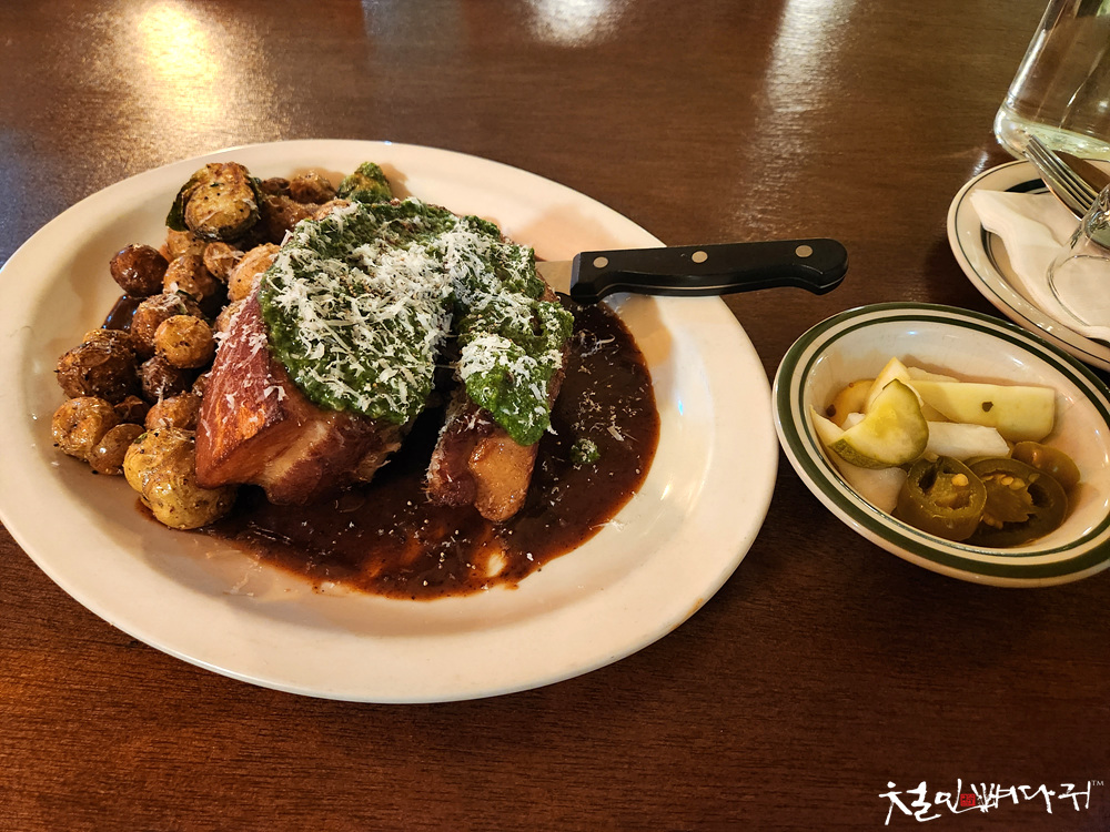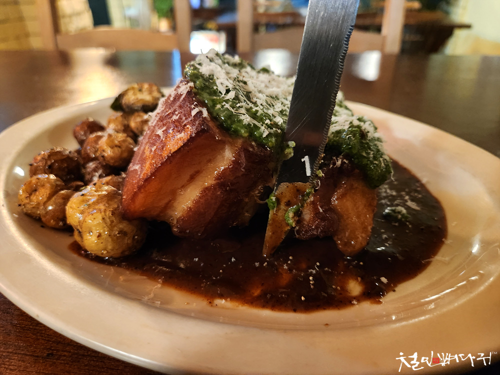 몇 가지 문의한 후, 오겹살 포르게따를 주문합니다.
