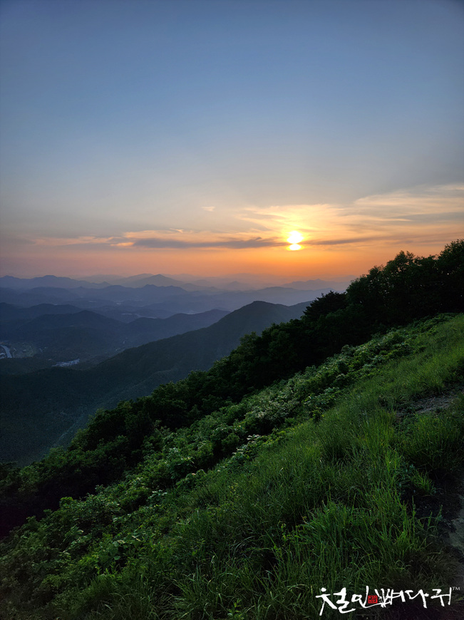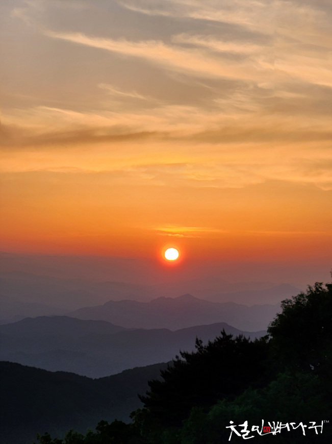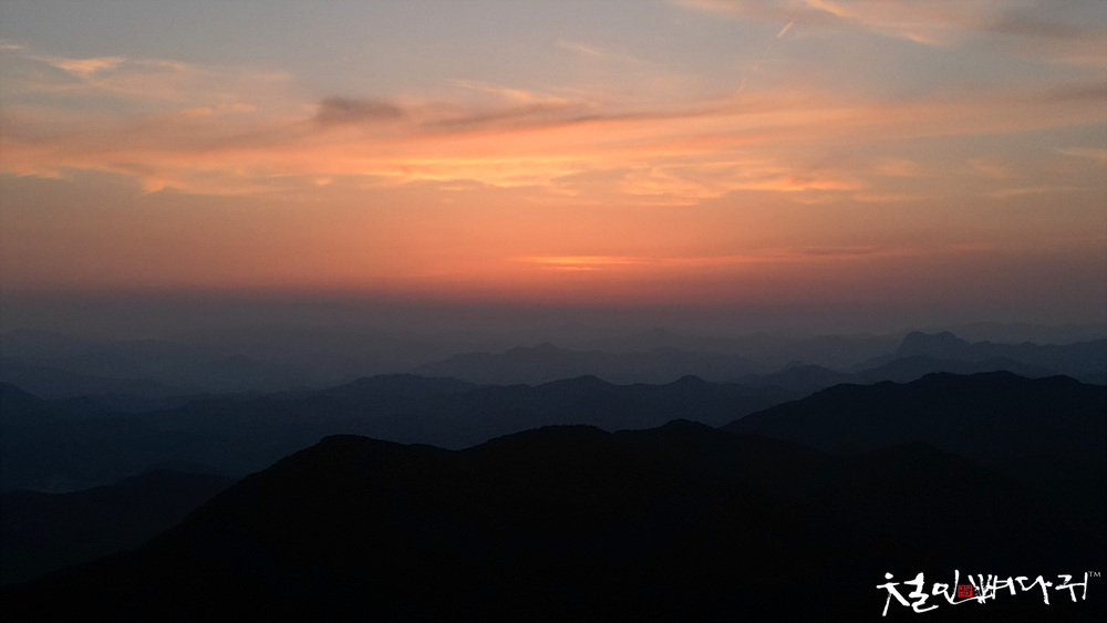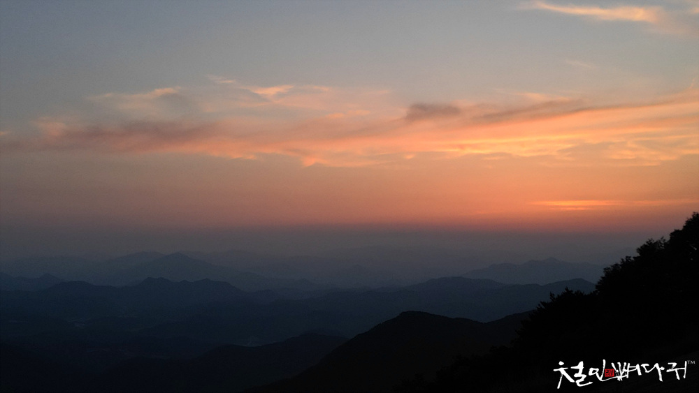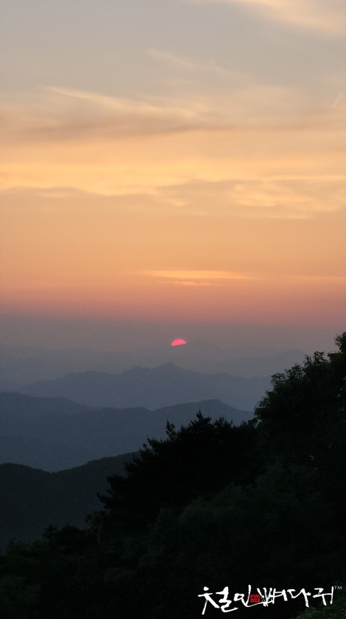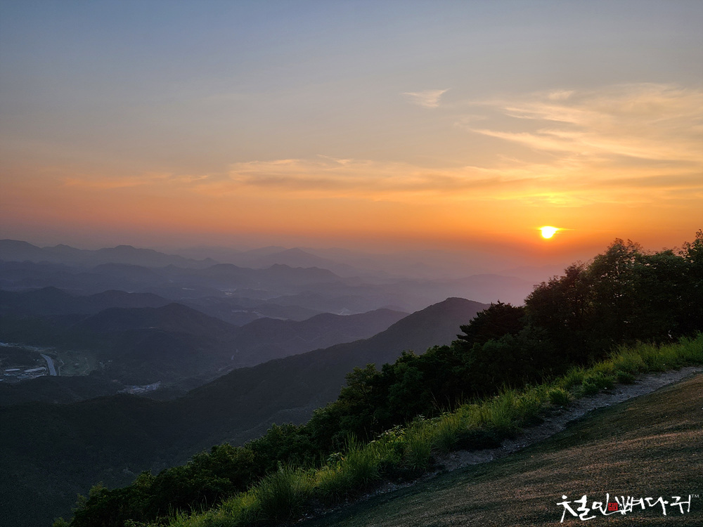 보는 노을은 산 비탈면으로 걸쳐서 보였습니다.