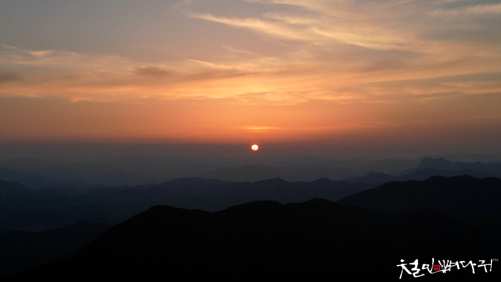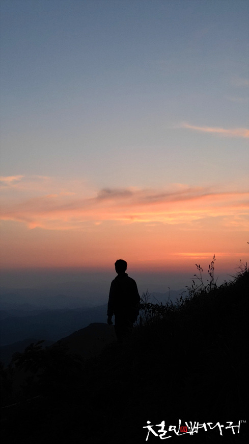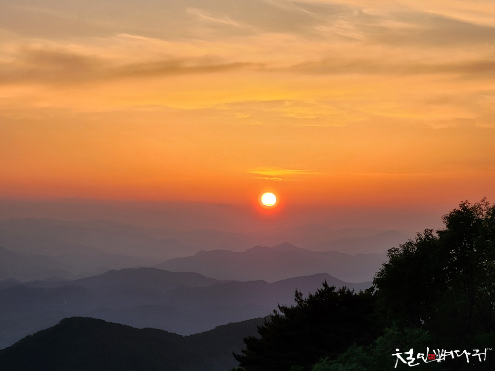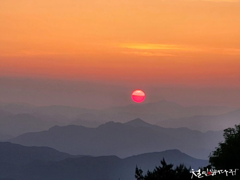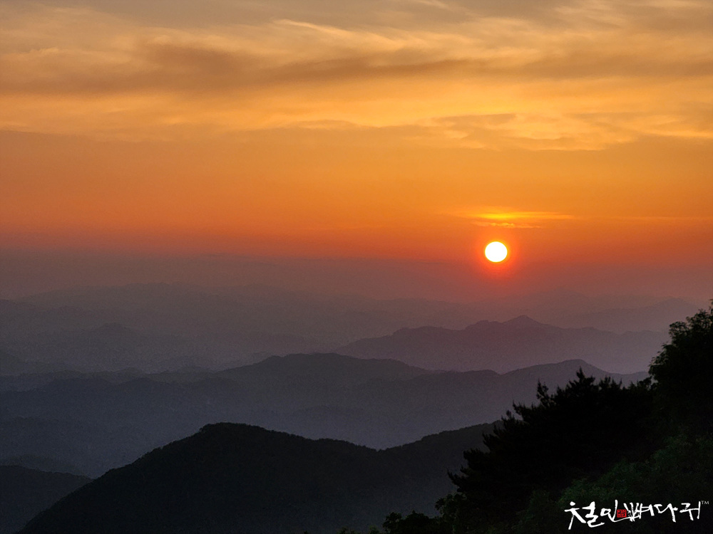 보는 노을은 산 비탈면으로 걸쳐서 보였습니다.