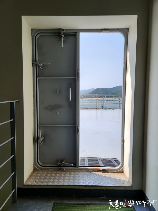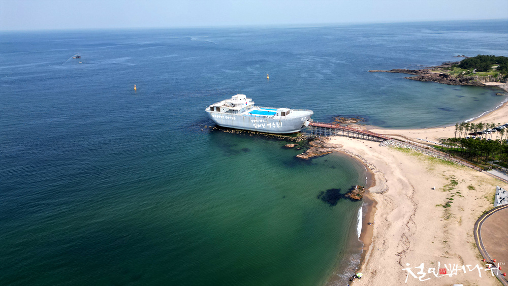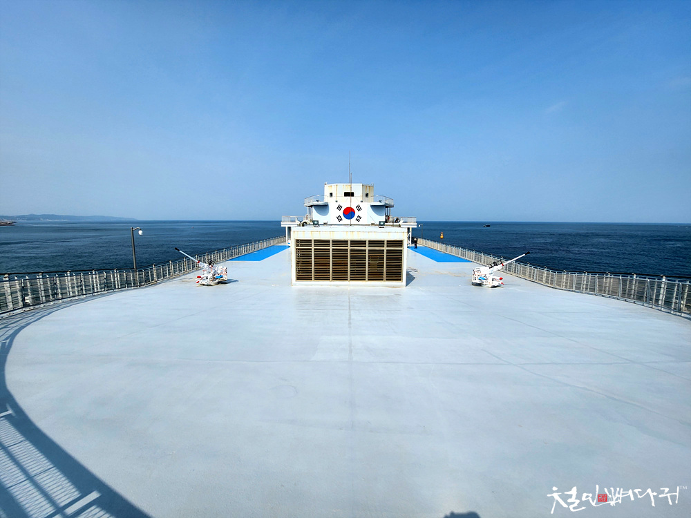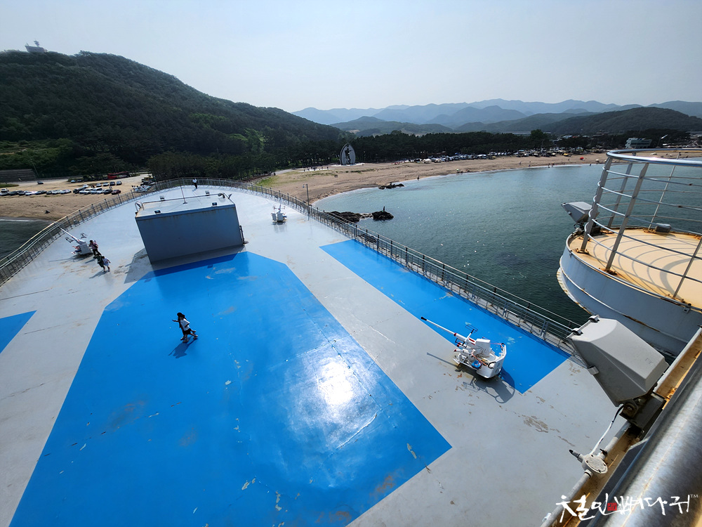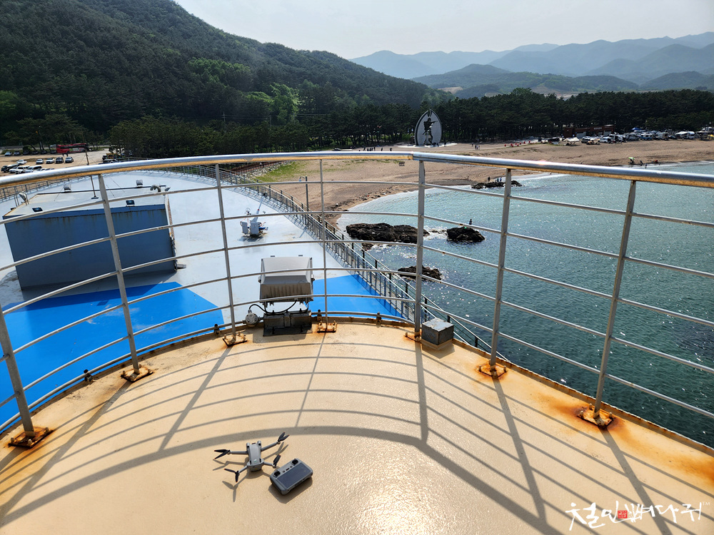 갑판 위에 올라와 드론으로 주변을 촬영합니다.