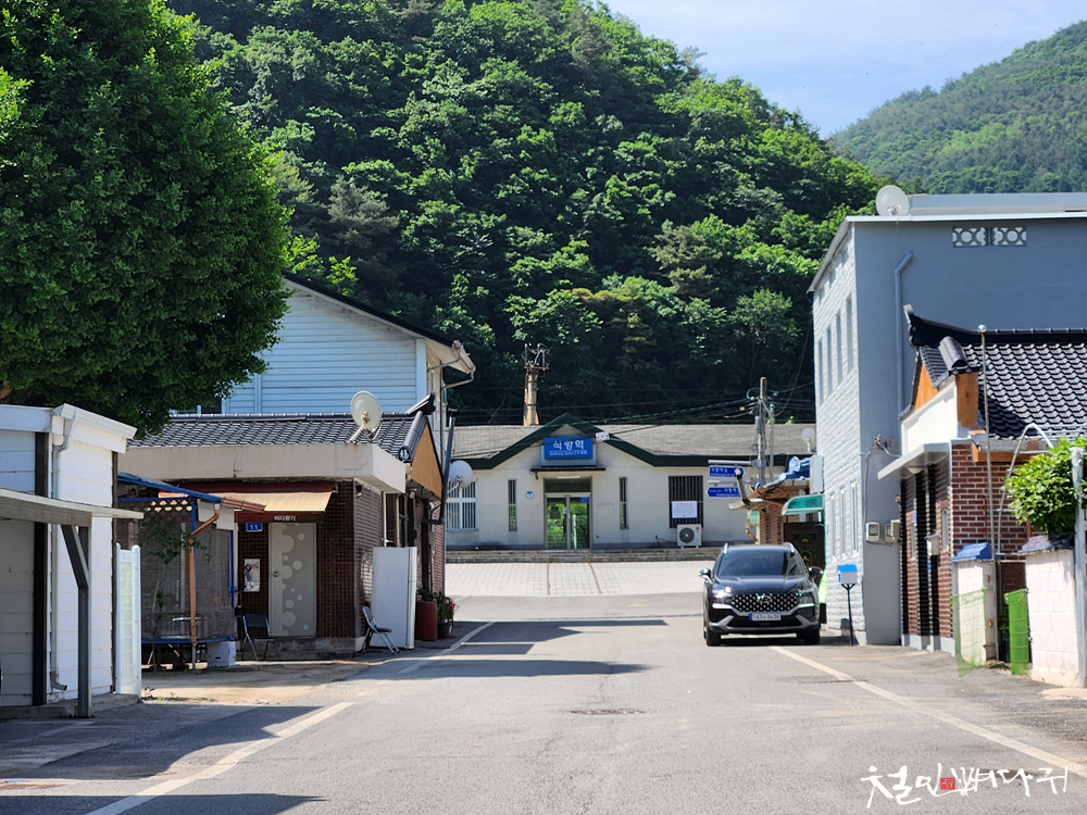 마을 길에서 집들 사이로 보이는 석항역