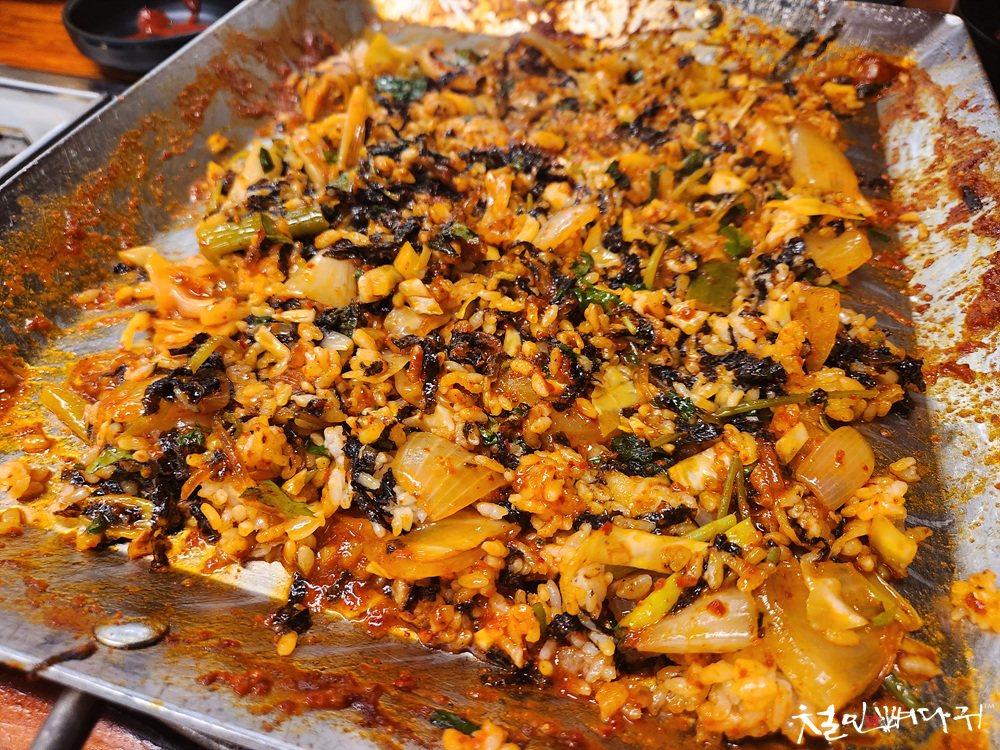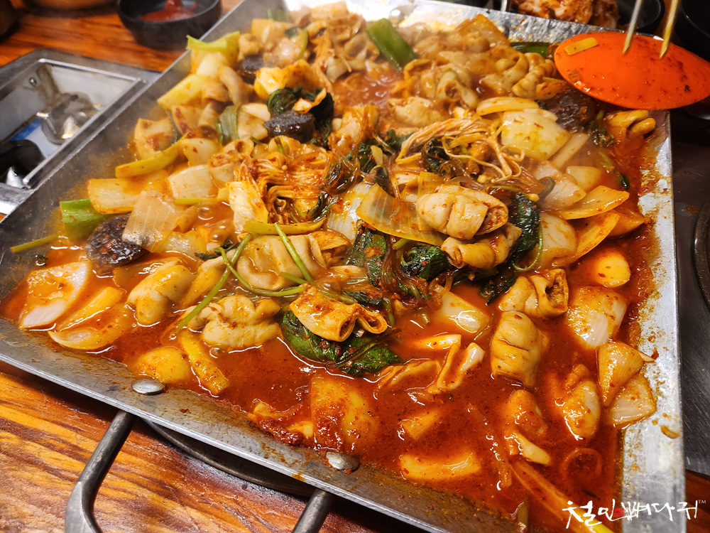 철판에 내장볶음 재료들이 올려진 상태로 나옵니다.