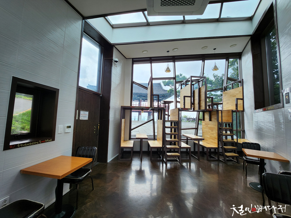 2층 구조의 테이블들이 유리 쪽으로 있어서