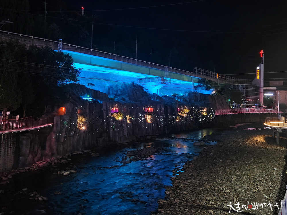 반짝이는 조명과 데크산책로가 있고,