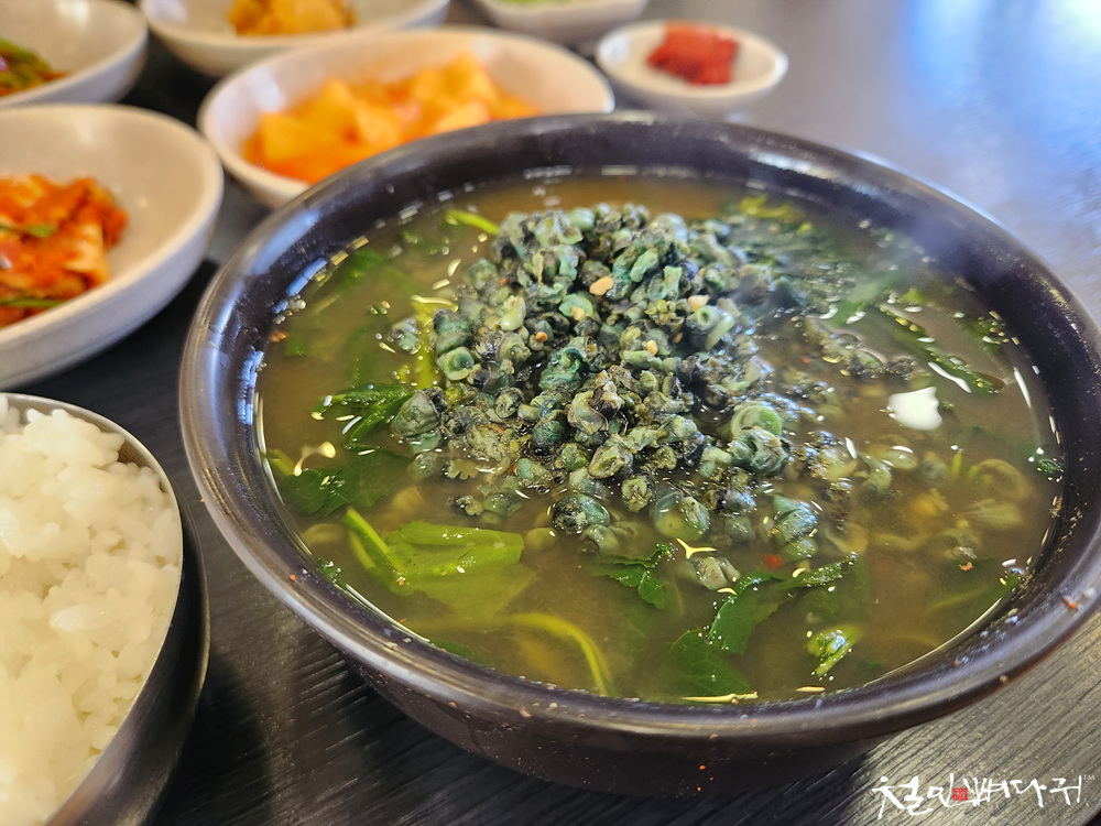 아욱이 가득하고 올갱이도 듬뿍 올려져 나옵니다.