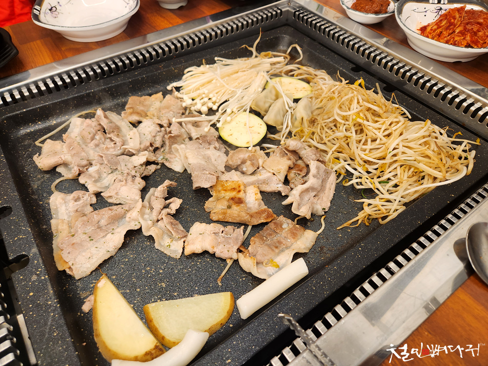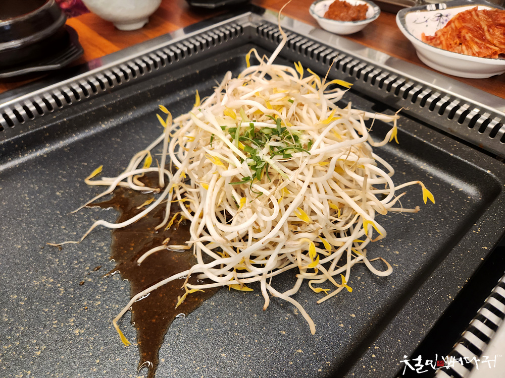 대패삼겹살 익히고, 숙주나물도 익어가고,