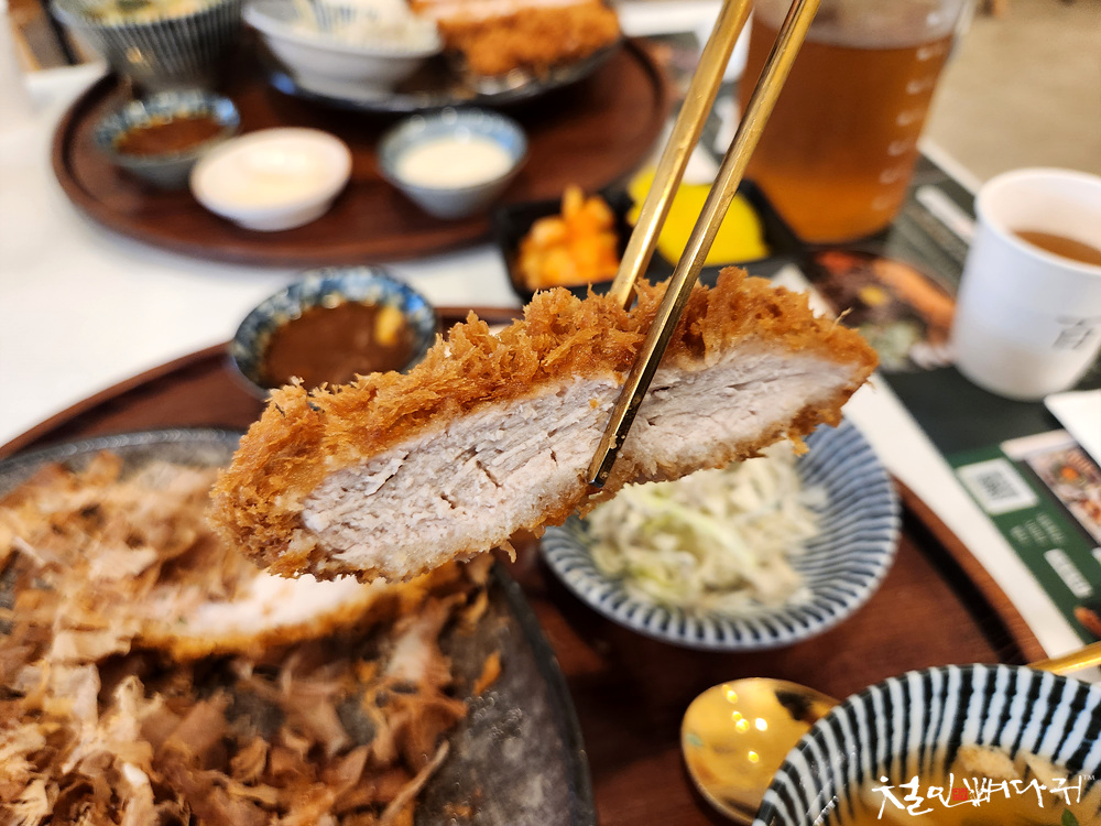 돈까스의 돼지고기는 두툼해서 몇 개 안 먹었는데도