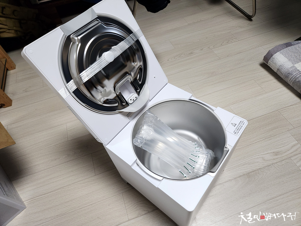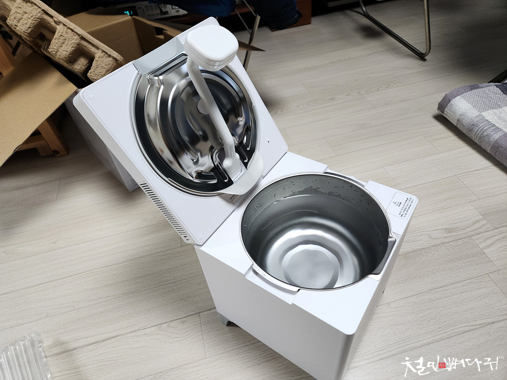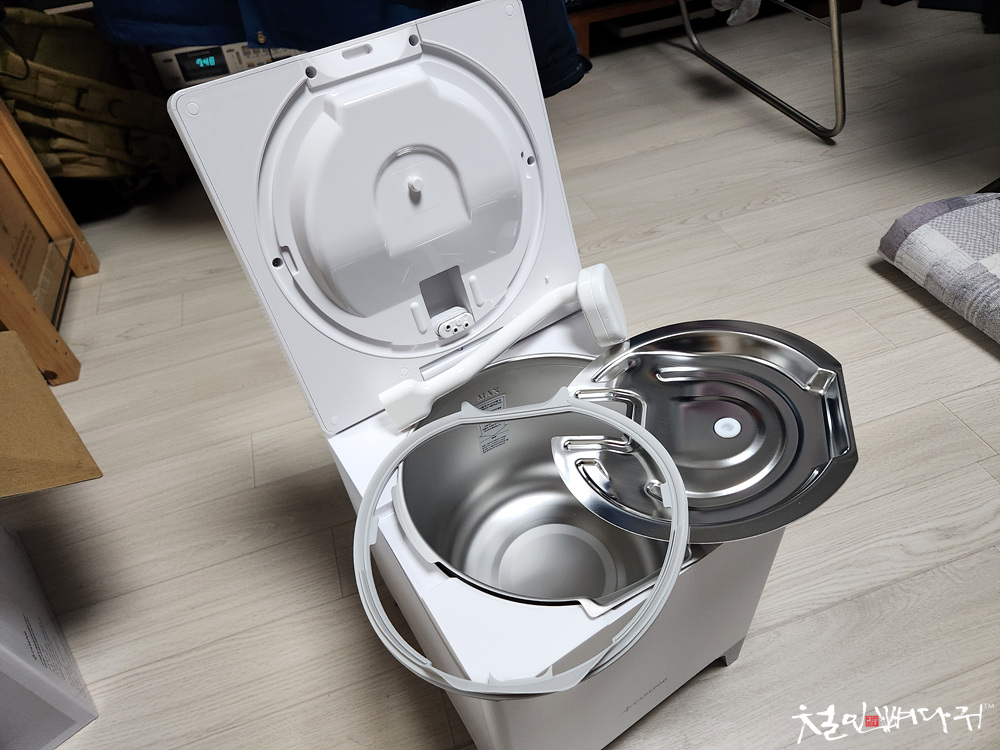 뚜껑을 닫으면, 진동자가 솥 가운데로 들어갑니다.