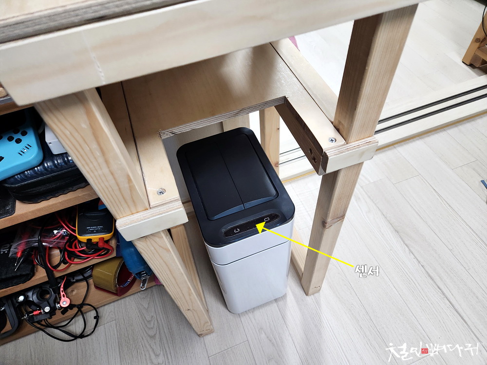휴지통의 센서를 가릴만한 부분을 잘라냈습니다.