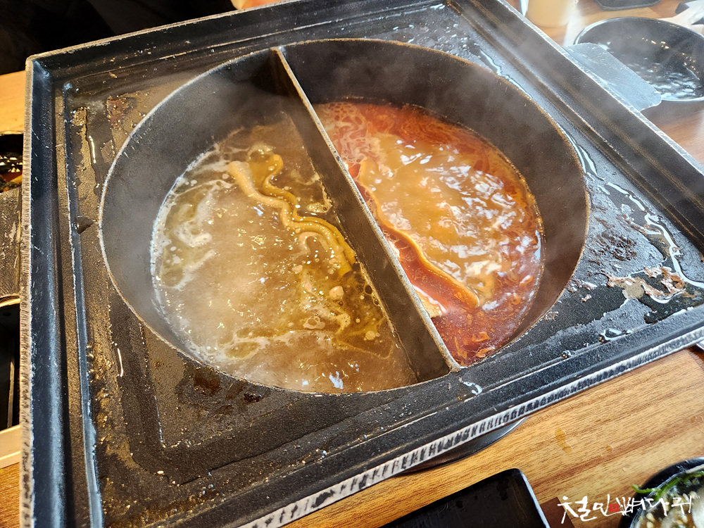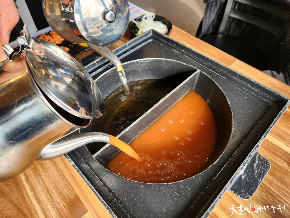 그릇에 매운 육수, 일반육수를 넣었습니다.