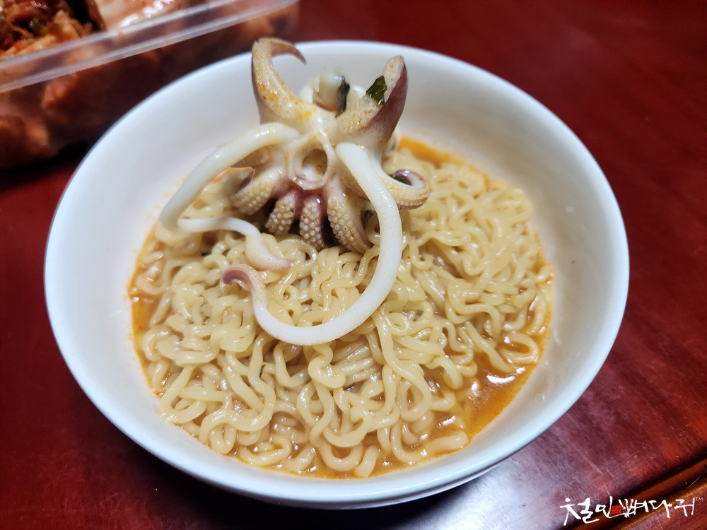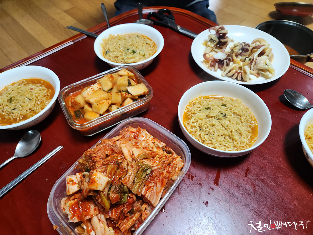 라면을 그릇에 담고, 다리 하나씩 지급받아서 먹었습니다.