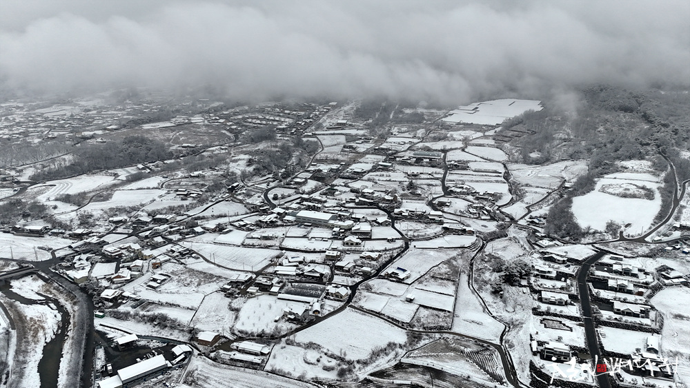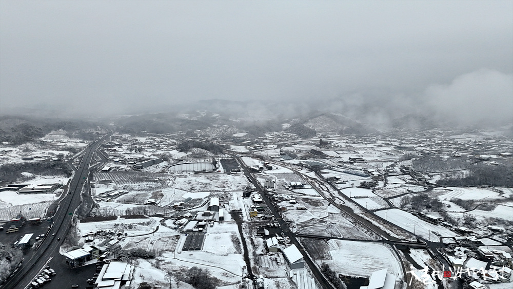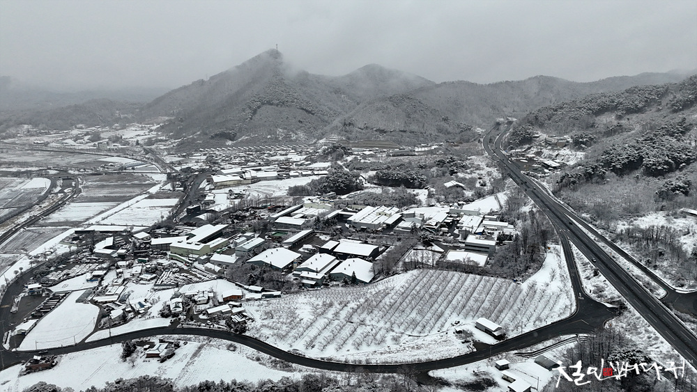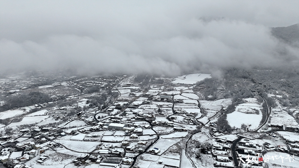 눈구름에 가려진 송학산, 그 아래 눈덮힌마을