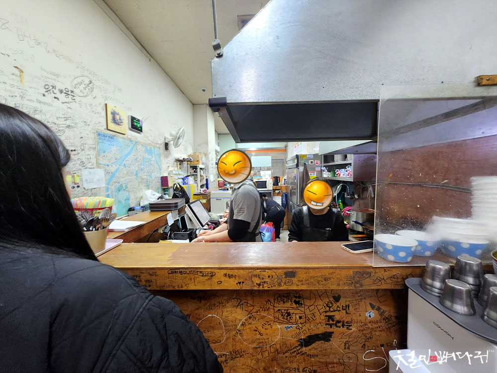 긴 구조의 식당에 양면에는 낙서가 가득했고,