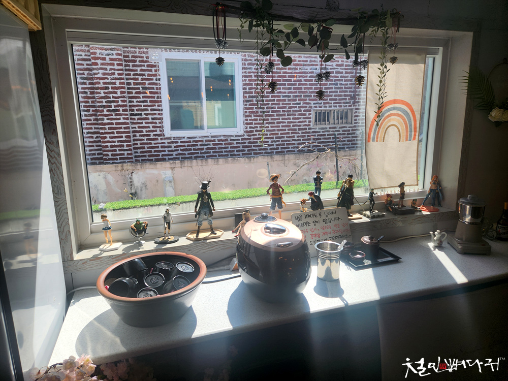들어오는 입구 쪽 옆, 창가에 밥솥이 있습니다.