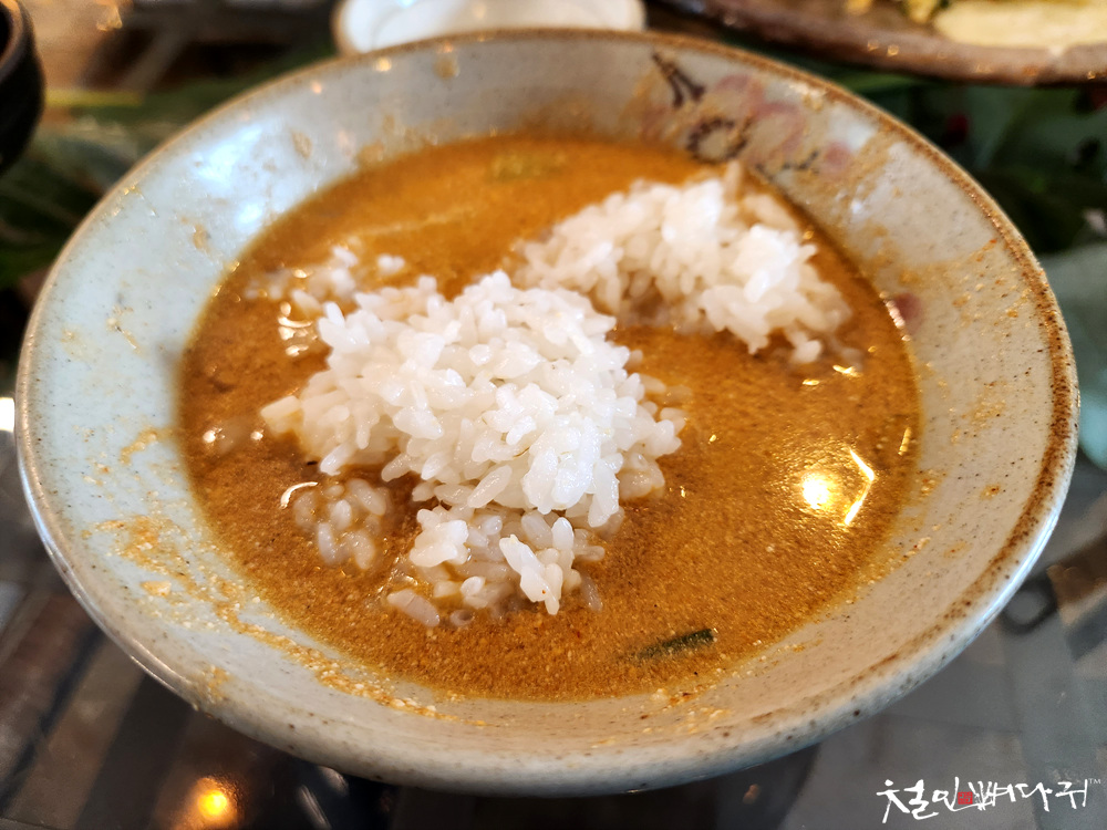 밥 반공기 정도 퍼와서 국물에 말아먹었습니다.