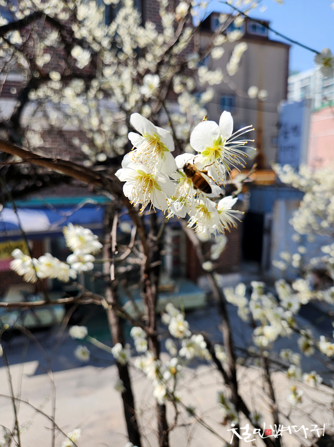 입구 옆 화단에는 매화가 피었습니다.