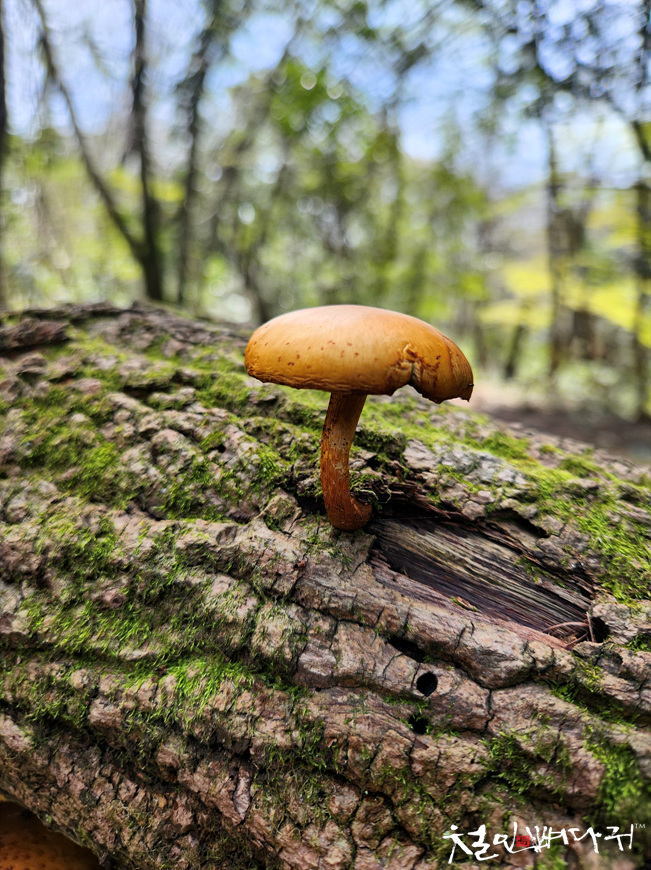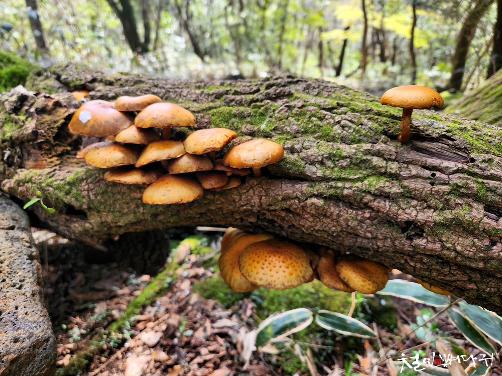 가던 중에 넘어져 있는 나무에 자란 버섯들