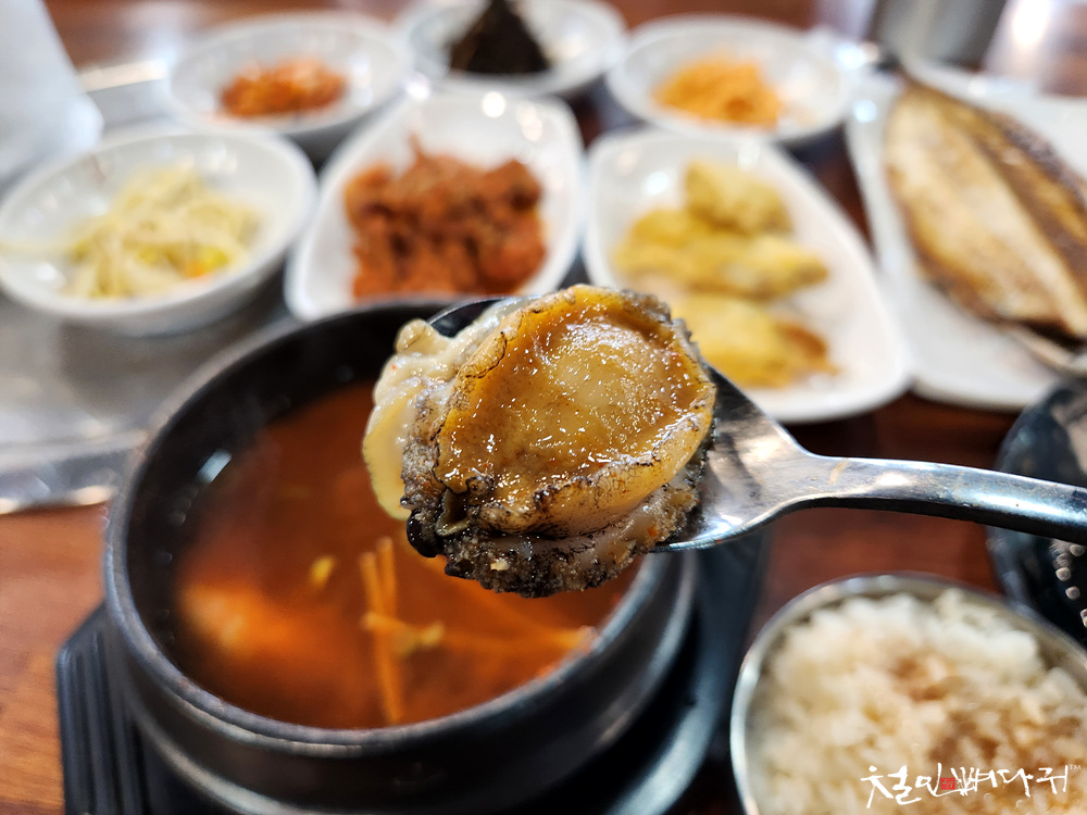 뜨거운 국물에 전복 살짝 넣었다거 한입에 먹었습니다.