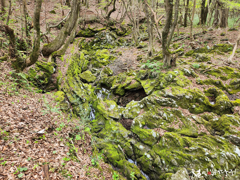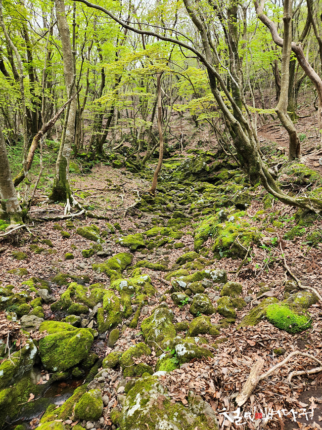 내리막길에 이끼가 가득한 바위들이 많았는데,