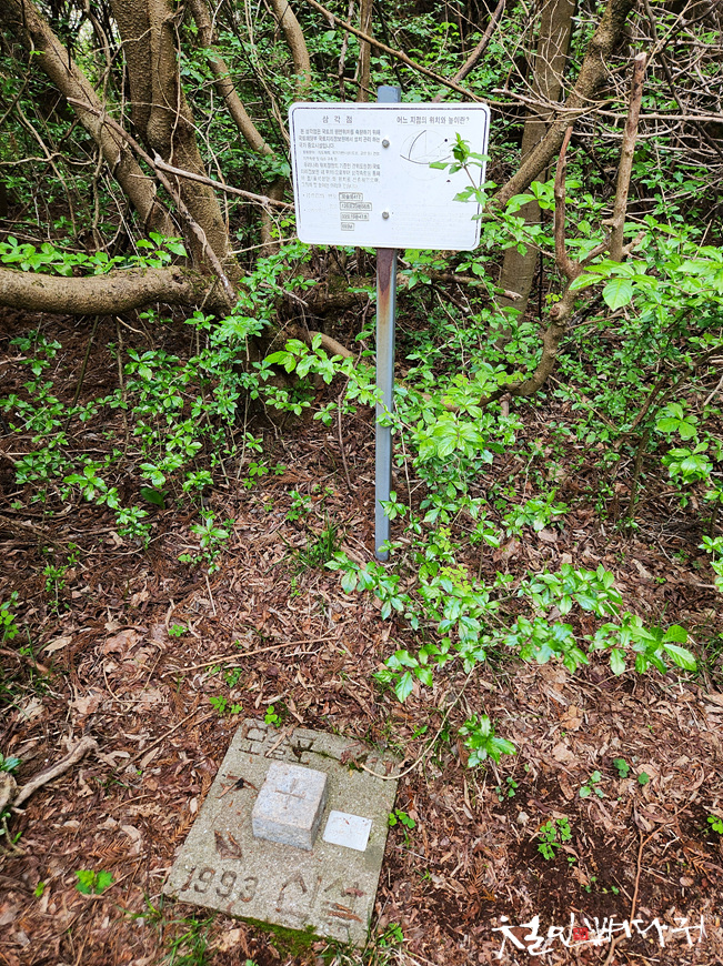 숲 속 오솔길에 위치석 하나가 딸랑 있는 이곳이