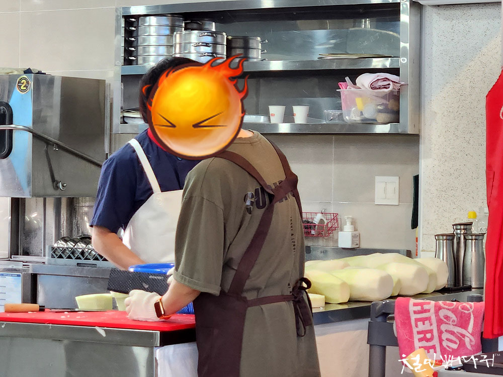 오픈주방에서는 반찬인 무를 열심히 자르고 있습니다.